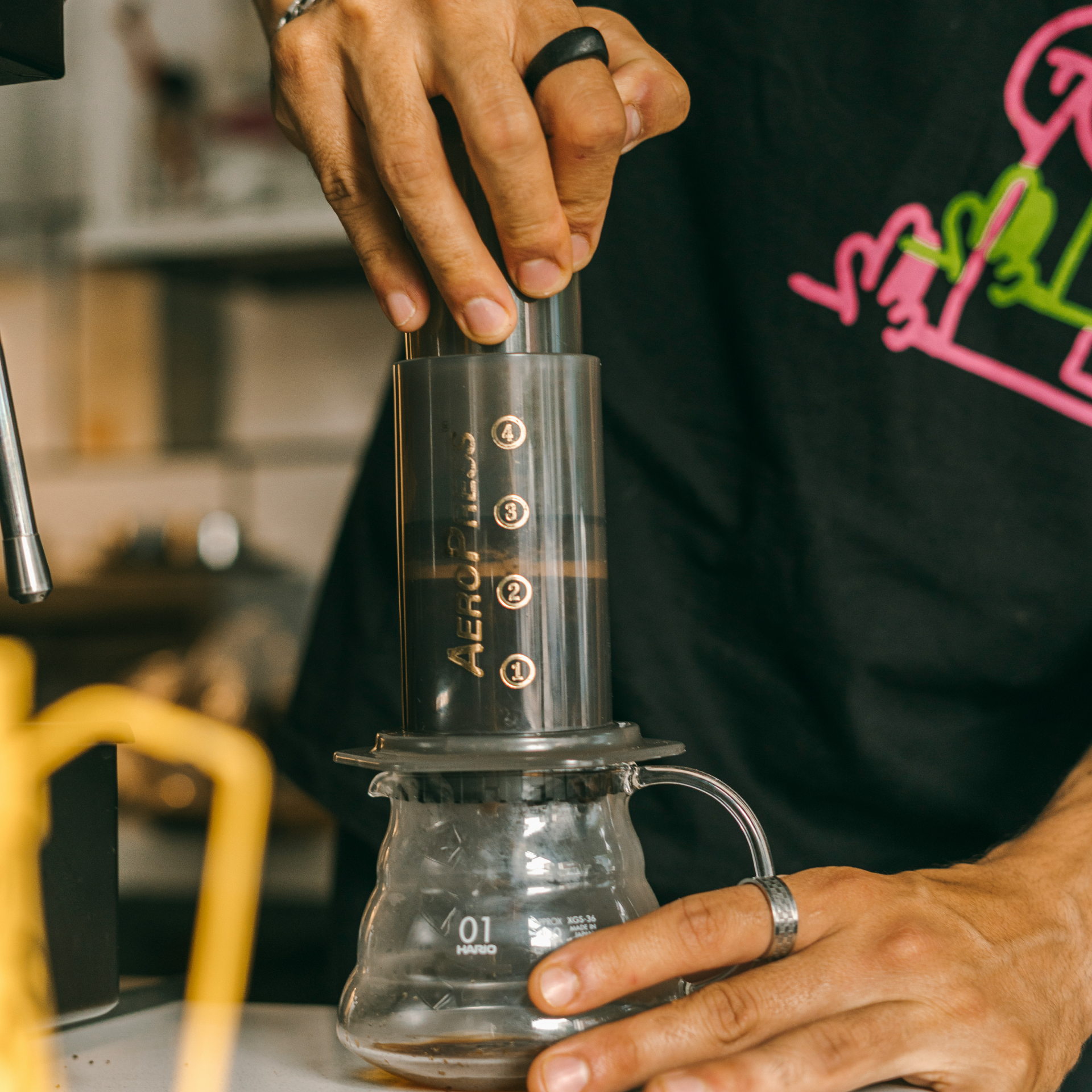 Carefully flip AeroPress onto mug and gently press plunger for ~15 seconds, stopping when you hear it “hiss."